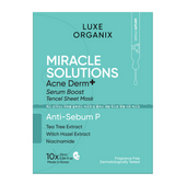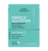 Luxe Organix Miracle Solutions Acne Derm+ Tencel Sheet Mask is made with Anti-Sebum P complex which helps minimize pores and control sebum production, Witch Hazel & Tea Tree extract to soothe and calm acne breakouts, With added benefits of Niacinamide to help lighten dark spots over time.